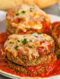 Breaded chicken topped with marinara sauce and mozzarella cheese, served with angel hair.