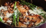 Sauteed chicken, madeira wine cream sauce, fresh asparagus, topped with melted cheese, served with mashed potatoes.