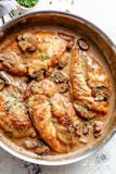 Pan-fried chicken, mushrooms, capers, fresh lemon, white wine garlic butter sauce over angel hair pasta.