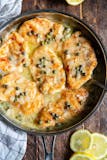 Chicken cutlets dredged in seasoned flour, dipped in egg, then gently fried in olive oil and butter, in a fresh lemon white wine sauce served over angel hair pasta.