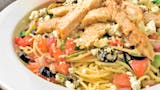 Pan-seared chicken breast, garlic, kalamata olives, tomatoes, feta, olive oil over angel hair.